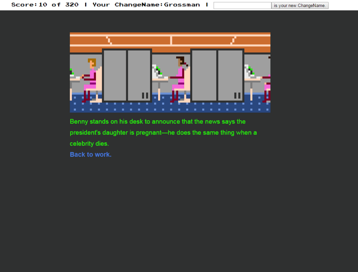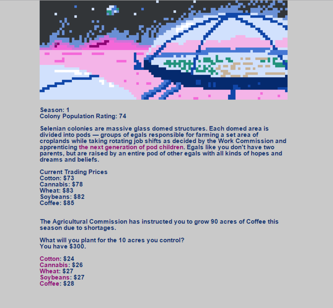 A Twine game about life during war between the Earth and Moon in the year 2000. Fall in love, subsistence farm, make spreadsheets, and wear colorful jumpsuits!