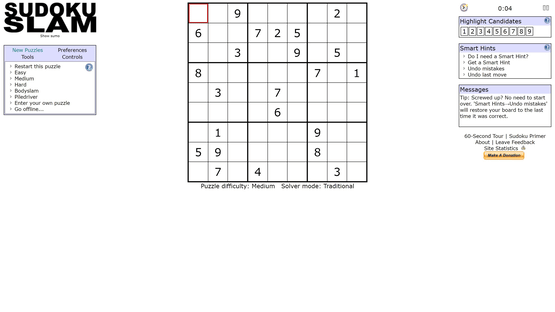 A free web Sudoku site unlike any other. Use smart hints to teach you new moves, save/share puzzles, undo screw-ups, print to PDF, enter your own puzzle, and download puzzles to play offline. Designed by AJ Shankar and Bill McCloskey.