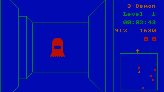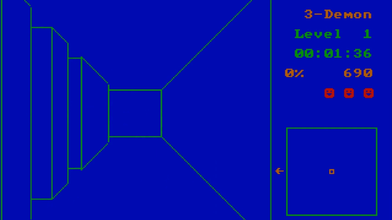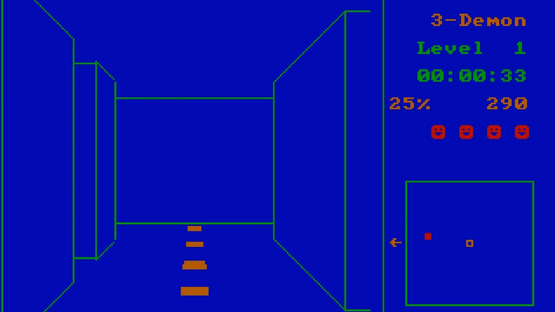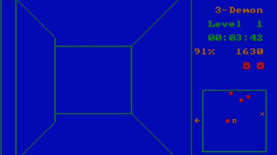 3-Demon is a Pacman game in 3D. You have to go through a maze, collect dots and avoid the enemies. After having cleaned the level of a certain percentage of dots, you have the option to move to another level immediately by pressing the down key, where the enemies are smarter and move faster.