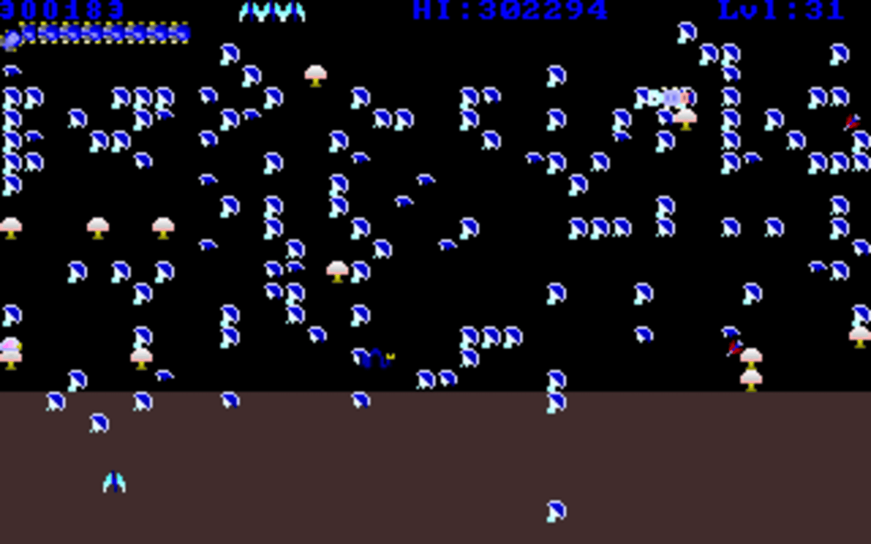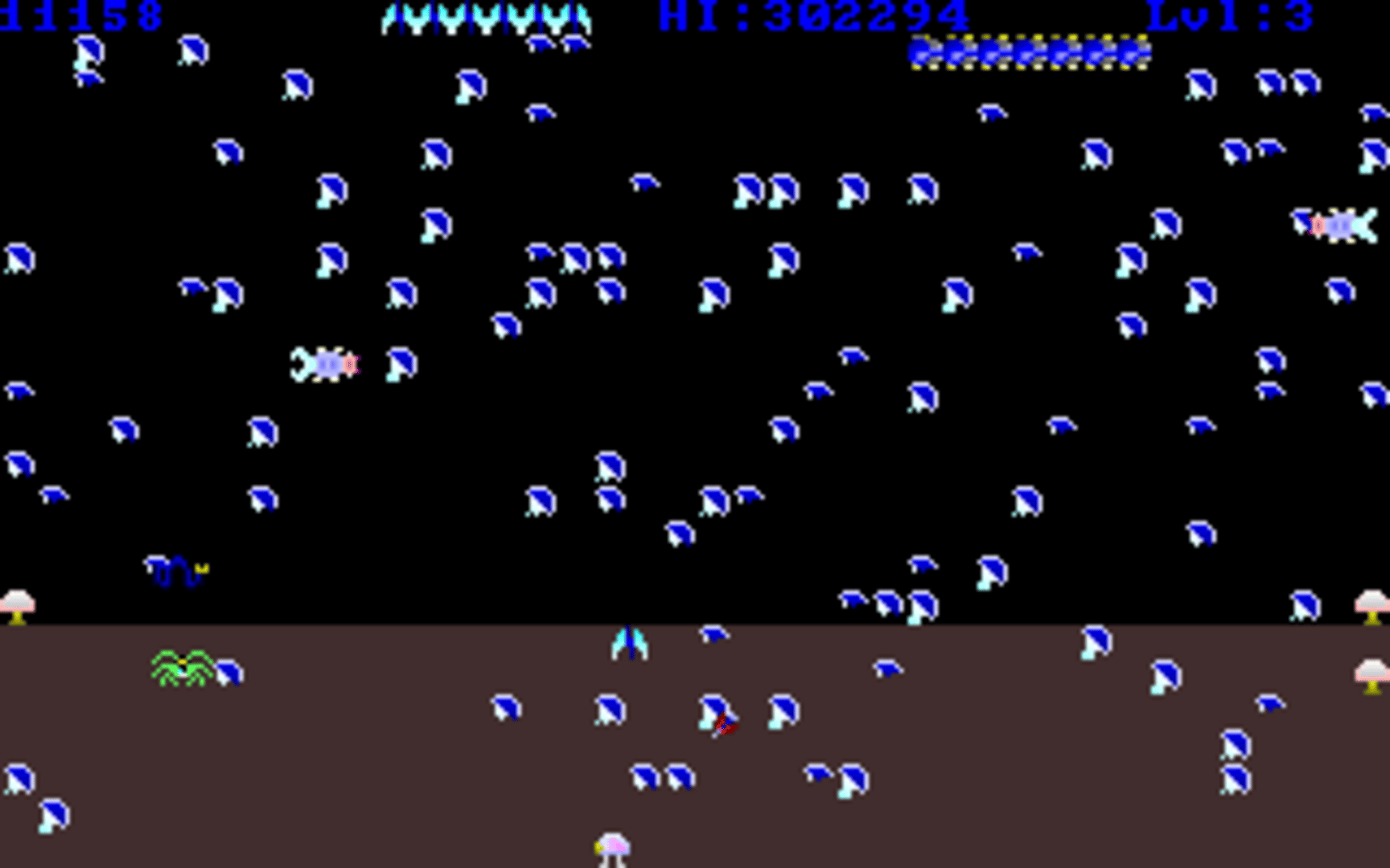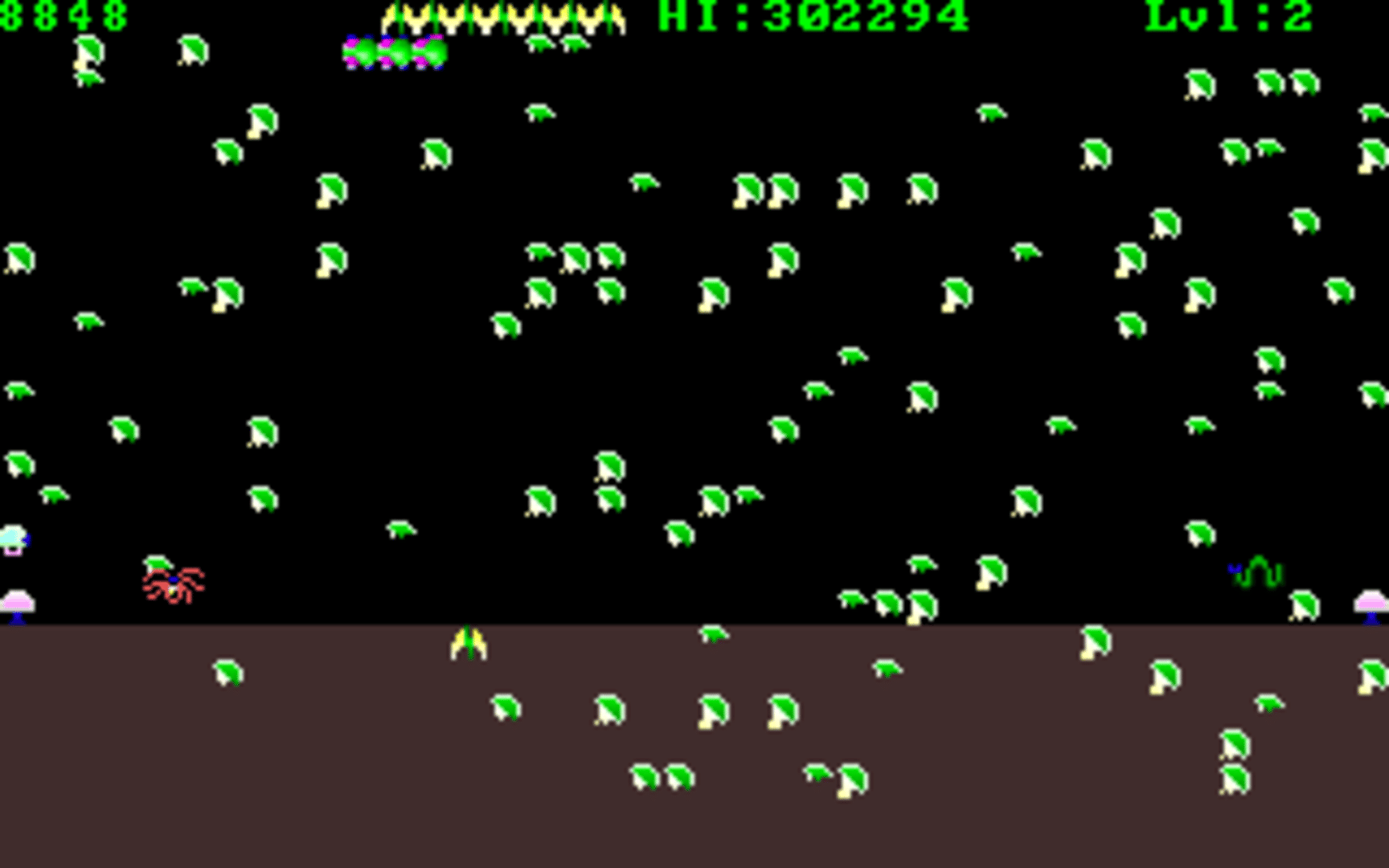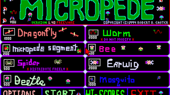 Micropede is a fast-paced arcade-style shooter inspired by classics like Centipede and Millipede. Players control a character using a mouse, navigating through increasingly difficult levels while shooting segmented enemies and avoiding contact with hostile creatures. The game features 500 levels, each filled with micropede segments and other enemies such as spiders, mosquitoes, dragonflies, bees, and beetles