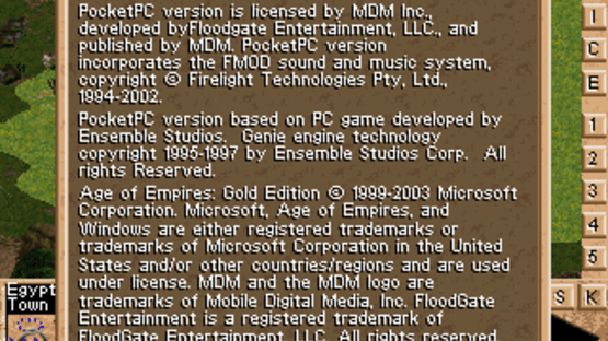 Age of Empires: Pocket PC Edition is a conversion of Age of Empires: Gold Edition PC version. It keeps most of the features and functions of the PC version, and has both original Age of Empires elements and the The Rise of Rome expansion enhancements. Given limits inherent to Windows Mobile based Pocket PC devices, not all elements from the PC game could be converted. The following are not in the Pocket PC Edition: - No multiplayer support - No support for large random map games - No Windows Mobile based Pocket PC campaign editor -If players have the PC campaign editor they can create games and download them for use on Windows Mobile Pocket PC Edition.