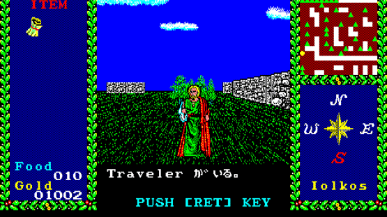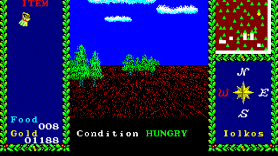 Argo is a role-playing game set in a pseudo-3D continuous world. The player explores the environments from a first-person view. It is possible to try to talk to any encountered character, as well as attack anyone. Most battles take place within the exploration area and involve a fairly simple turn-based exchange of attacks. However, occasional fights against larger monsters take place on a separate screen, have an over-the-shoulder third-person perspective, and require the player to move and attack in real time. Experience points and gold are awarded for defeating enemies. It is necessary to feed the protagonist; when his condition is "hungry" food also restores a portion of his hit points.