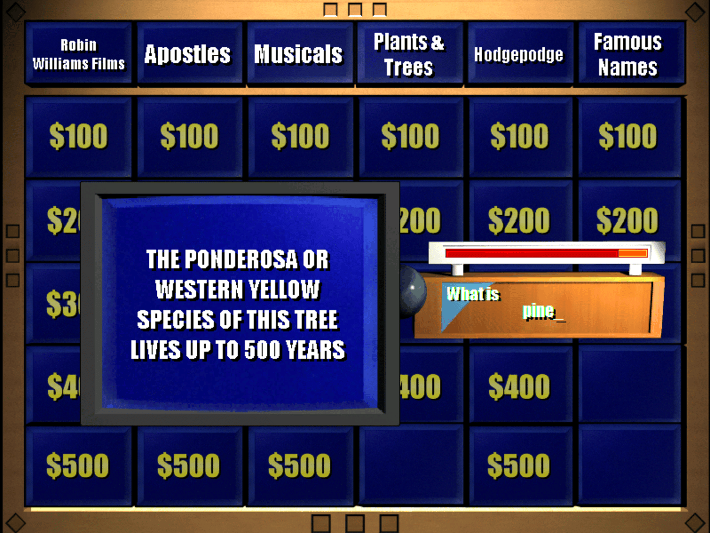 Based on the well known game show of the same name. The basic idea behind the game is that you are given a choice of categories, each with an answer to a question behind the square. Your job is to figure out the question that corresponds to the given answer (for example, the answer is Star Wars. The question would be: George Lucas' Trilogy?, or something like that.) There are over 3500 answers to find questions to, in different game types including Tournament, Speed Match and Single Round. And in every case, Alex Trebek (the host) is there to tell you if you are right or wrong.