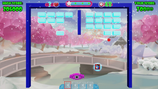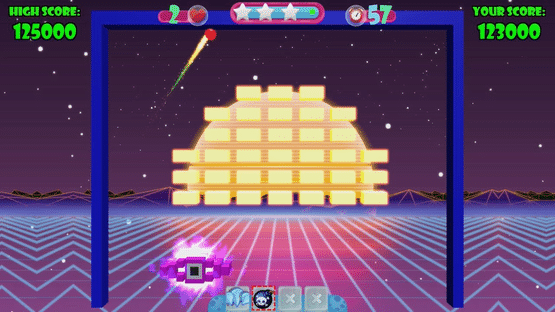 Play 1 or 2 player mode across ten unique themes and destroy all the bricks to progress. Collect power ups and use them to help you (or in 2 player mode, to hinder your opponent). Each theme is playable on a Bronze, Silver, or Gold setting, with difficulty increasing according to the selection.