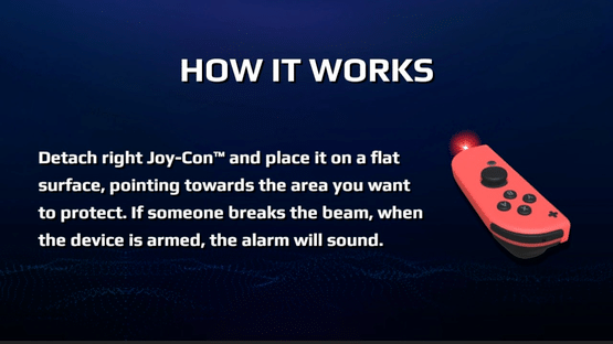 Spy Alarm guards your stuff! Spy Alarm works by transmitting an invisible infra-red trip wire which if broken sounds an alarm. Switch between four different alarm sounds and as a bonus Spy Alarm comes equipped with an intruder logger which lets you see exactly when and how many times the alarm was triggered while you were away. So how does it work? Spy alarm transmits an invisible infra-red beam from IR Camera at the bottom of the right Joy-Con, if someone or something crosses the beam, the beams bounces back to the IR Camera which then sounds the alarm. Spy Alarm works better if placed on the edge of a flat surface with a the range of up to 1 metre and even further when a white or reflective object breaks the beam.