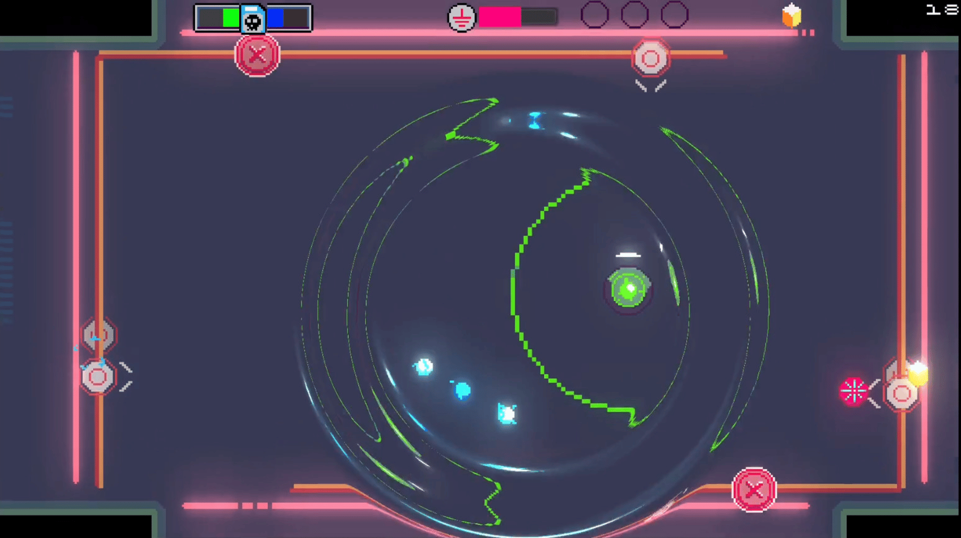 A byte-sized rogue-lite anti-shoot-em-up! Deflect and shoot down projectiles in 3 worlds of crazy bullet-heck action with semi-randomized room order and an upgrade system that provides a bevy of interesting ways to progress!