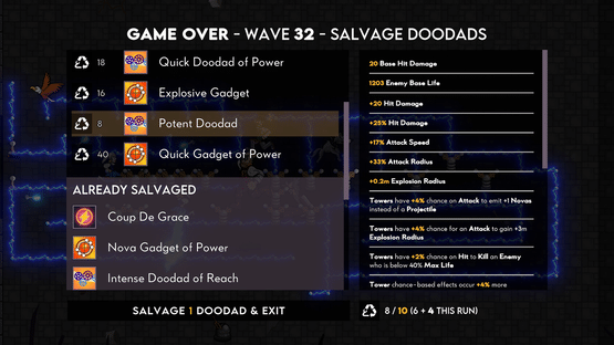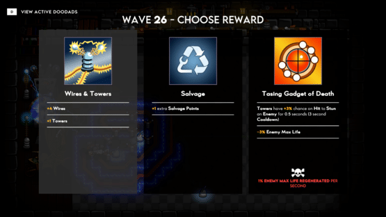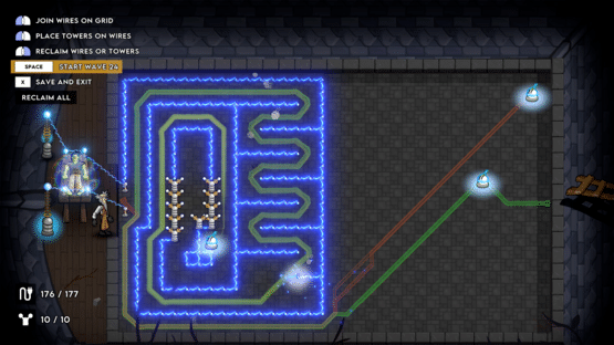 Roguelite TD: all towers & enemies start the same, but you have 1 choice per wave affecting BOTH and stacking up for dramatic variance. Gradually salvage and make some choices permanent to build deeper strategies. Also a unique mazing challenge where wires and towers must be linked to a power source