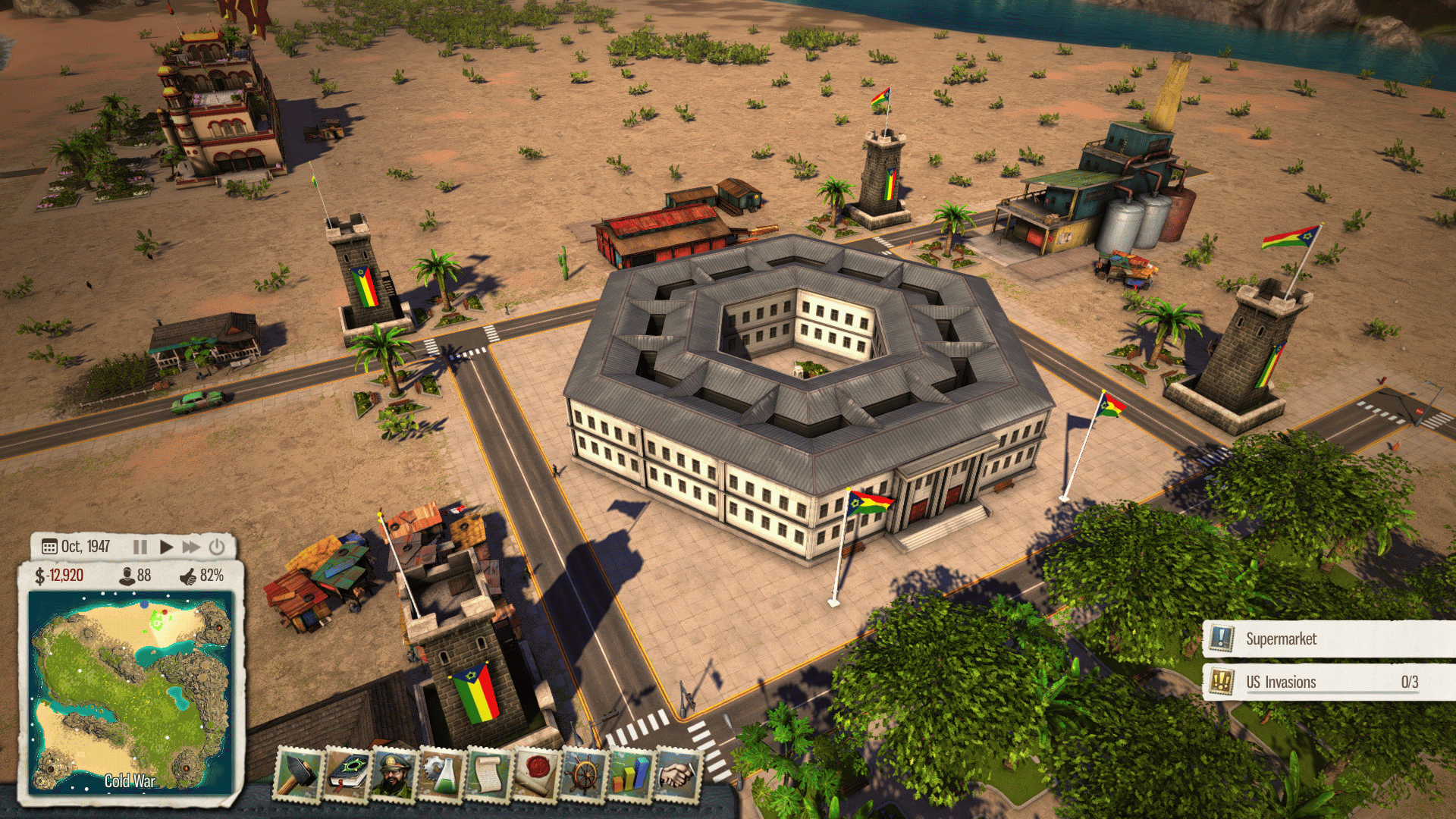 In this latest episode of Tropico 5, history is repeating itself while El Presidente prepares for all-out invasion and large-scale warfare! Build the majestic Defense HQ to instill fear in your enemies!