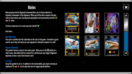 This expansion allows you to play as a legendary commander in the Star Realms universe! Each of these 7 decks replaces a player's normal starting deck, and modifies the player's starting Authority and hand size. This expansion also adds Chapter 22 to the ongoing single-player campaign.