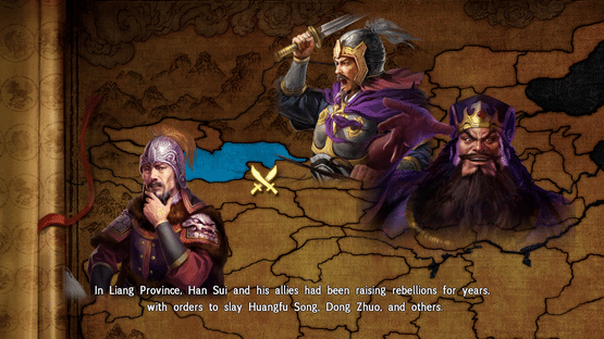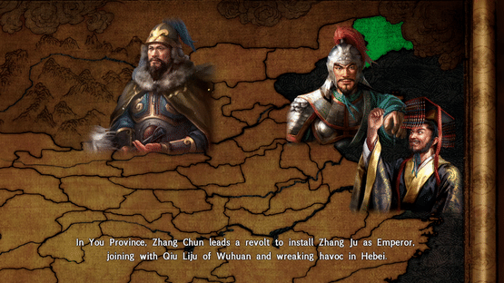With the fall of Zhang Jiao, the Yellow Turban Rebellion ended, but revolts occurred against the Han across the land. However, at the palace, He Jin and the Ten Eunuchs spent all of their time on political infighting.