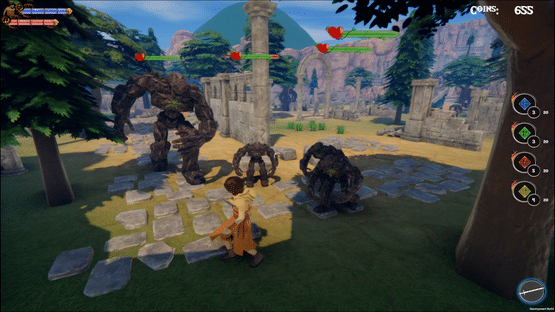 A boy is trying to find jewelry that was stolen from him. you have to face the enemies and beat them, and collect blue, red, yellow, green jewels to win the game. there are different enemies some of them have arrows, some of them get out of the ground. use the sword or bombs to fight them and overcome them.