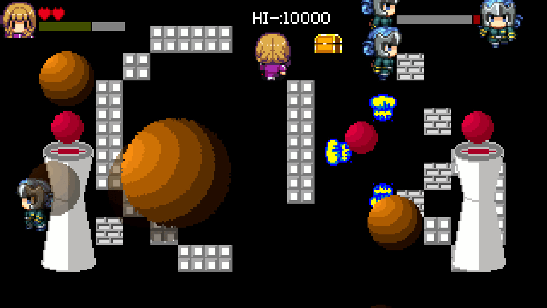 You found some prehistoric magic towers in the cave. Red gemstones emit red light balls that move in the air. You move forward carefully, don't touch these light balls, you'll get hurt. Once you've found the treasure, go to the next map quickly.