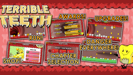 Prepare for an adventure with bite... 9 out of 10 dentists recommend Terrible Teeth! Terrible Teeth is an action arcade mobile game from Vile Media LLC. Play as Cornelius, a heroic kernel of corn trying to save his friends from certain doom!