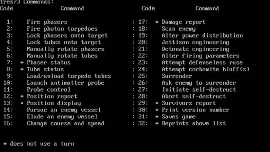 Trek73 is a computer game based on the original Star Trek television series. It was created in 1973 by William K. Char, Perry Lee, and Dan Gee. The game simulates battles between space ships of the Star Trek franchise. Through text commands, a player may order the ship to perform certain tasks in battle against an opposing vessel.