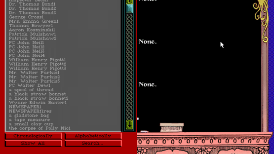 Back in 19th Century England, one man was able to kill and kill again without ever been caught. That man was Jack the Ripper. Now, the player is a Scotland Yard detective on the trail of this famous killer. He must converse with suspects, highlighting any important information that could be valuable to his case. Then, when he thinks he has enough evidence, the player pieces the clues together to finally catch the infamous killer.