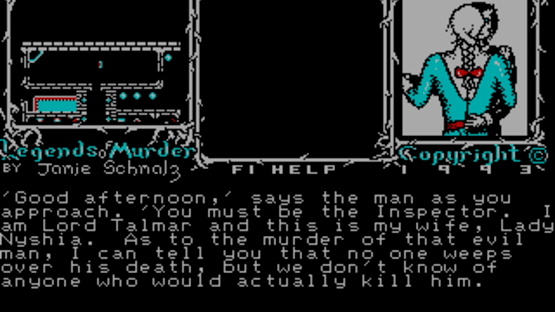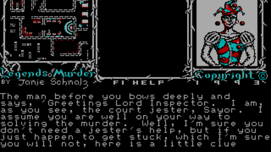 Legends of Murder is a fantasy/role-playing/murder mystery game. In Volume 1 of the series you, Inspector, have been summoned to a small castle near the harbor city of Erdwyn to investigate the murder of the King. Hired by the advisor of the deceased King, an elf named Ash, you set foot in the castle after a long journey across the sea, and the game begins... The ultimate purpose in the game is to discover the murderer of the King. The character is walking on a tiny map sized in 1/5 of the screen, and when he comes inside new room, the description is written. There are numerous riddles and puzzles to solve along the way, as well as many people to meet and places to explore. It is very important that you talk to everyone you encounter, search all rooms of the castle you enter, and make note of what you learn for later reference. The Inspector (of Fighter/Mage class) has a number of personal attributes, common for RPGs, which affect the play of the game. Spells must be learned from special books. The higher a character's level, the more powerful the spell he can learn.