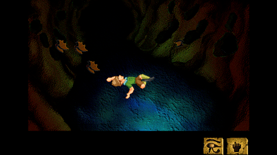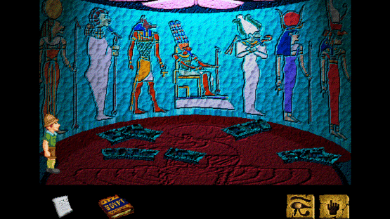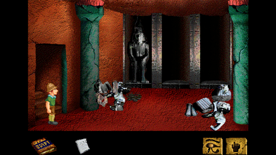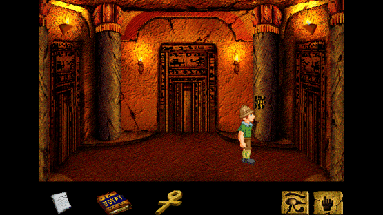 Secrets of the Pyramids is an edutainment title that includes 3 modes: a movie, discovery and game mode. The Movie mode presents a dramatic reconstruction of a series of events that could have taken place in Ancient Egypt. The Discovery mode describes Ancient Egypt culture, religion and history. In the Game mode you will follow Harold Peabody - dreamer, adventurer and optimist - on his quest for the hidden tomb of the mythical Pharaoh Ankh-Re. After finding a way to open the door to the pyramid, the player has to explore the pyramid, find useful items and overcome various obstacles. Stepping on the wrong tile or opening a wrong door may result in the untimely death of the hero. To avoid traps and decipher clues the player has to consult an "English-Hieroglyphics translator" found early in the game. Secrets of the Pyramids is a short, inventory-based adventure game with a simple interface (with a "look" and "use" icon). The player can only save one game at a time (by pressing the S-key). The game comes with a soundtrack and some sound effects; comments are shown in message windows that pop-up (no voices).
