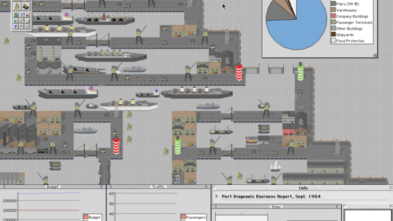 You have been asked to build a harbor for a town near the Atlantic ocean. With a starting capital of £200,000 from the city council, the work begins! SimHarbor is a harbor building sim. Set up the piers, equipment and storage needed to service over 120 different ships. Expand your infrastructure, balance your finances and protect your harbor from disasters in this compelling sim. Reading the manual before jumping in is highly recommended, this is a contender for the HyperCard engine's most complicated game.