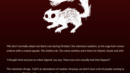 There's something wrong with your new cat. A ghost story about small creatures and the harm we do to each other. Warning: This game contains written descriptions of gore, animal death, emotional abuse, and fleshy abominations.