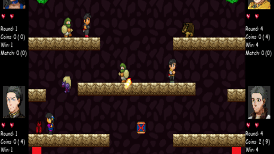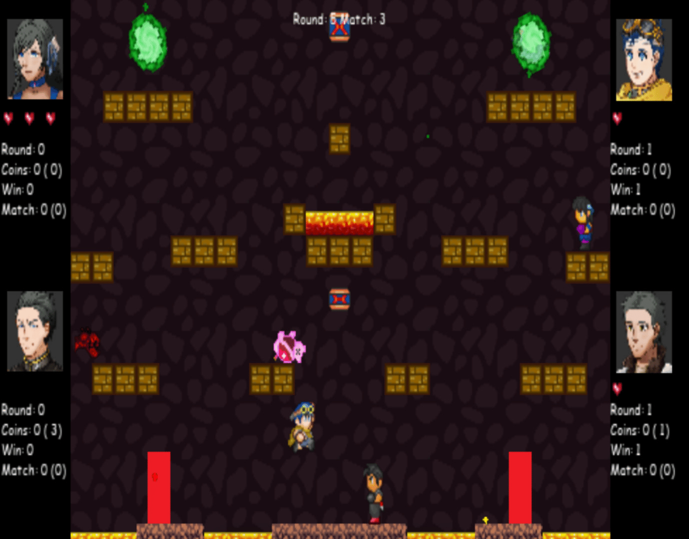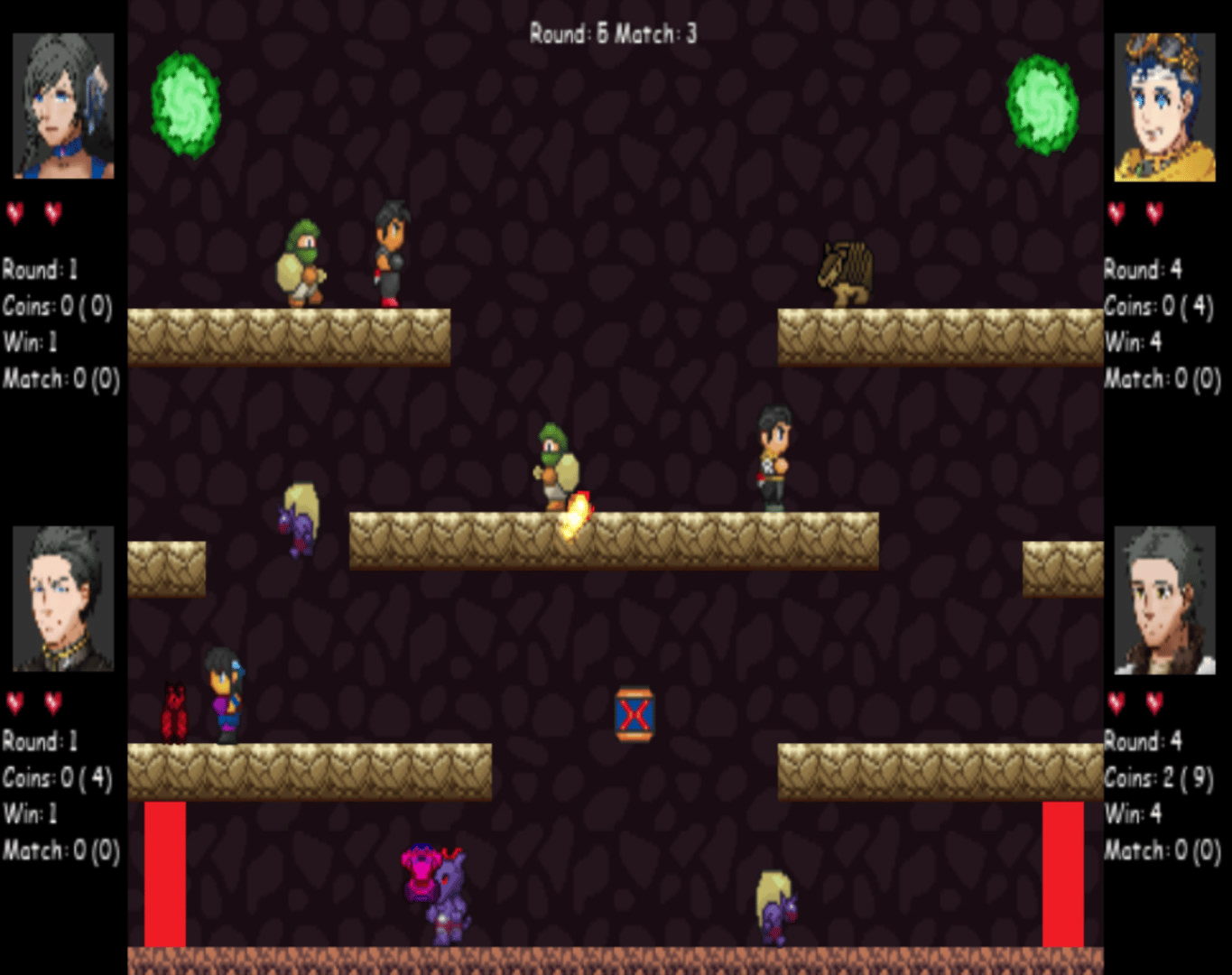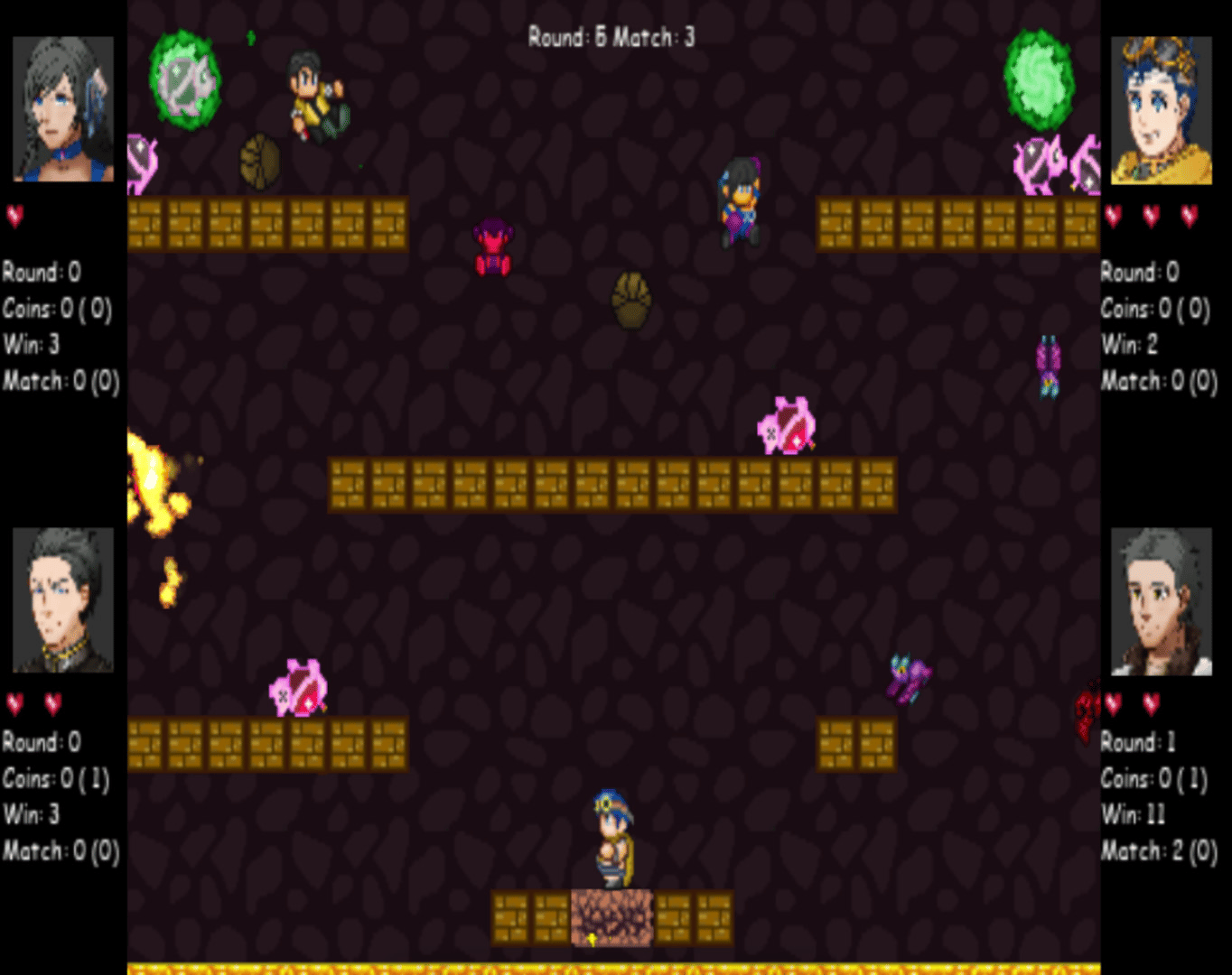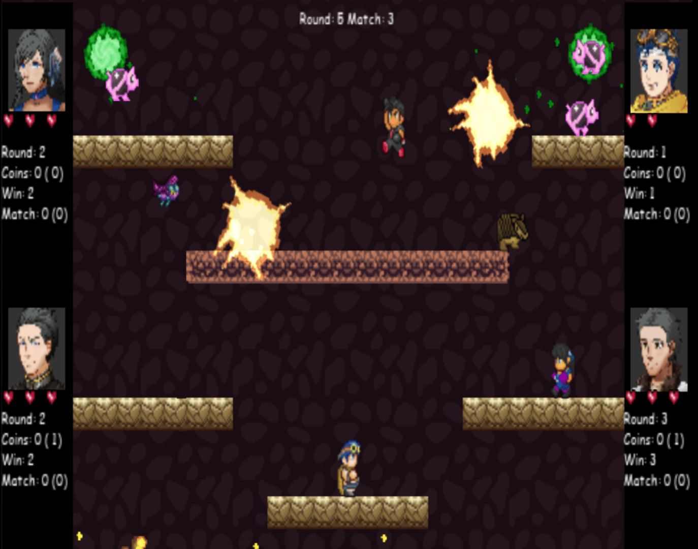 Harken back to the old school platformers! Heavily inspired by an Arcade Classic, use attacks, powers, and advanced tactics to eliminate enemies or your friends! Win by collecting 5 coins or being the last man standing! One thing is for sure, skills pay the bills!