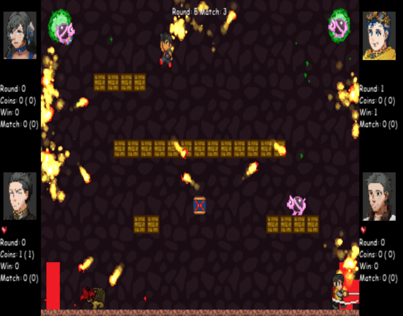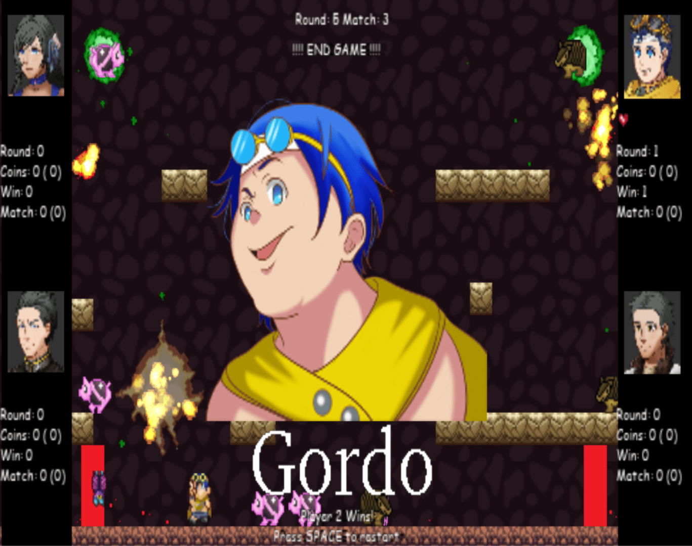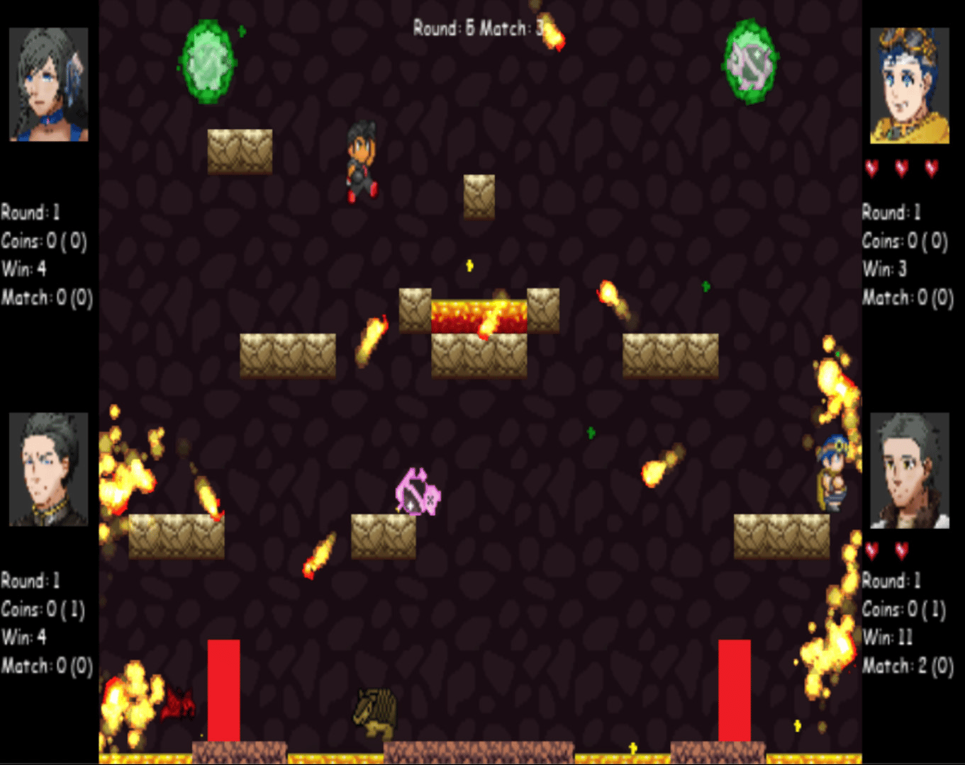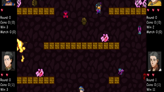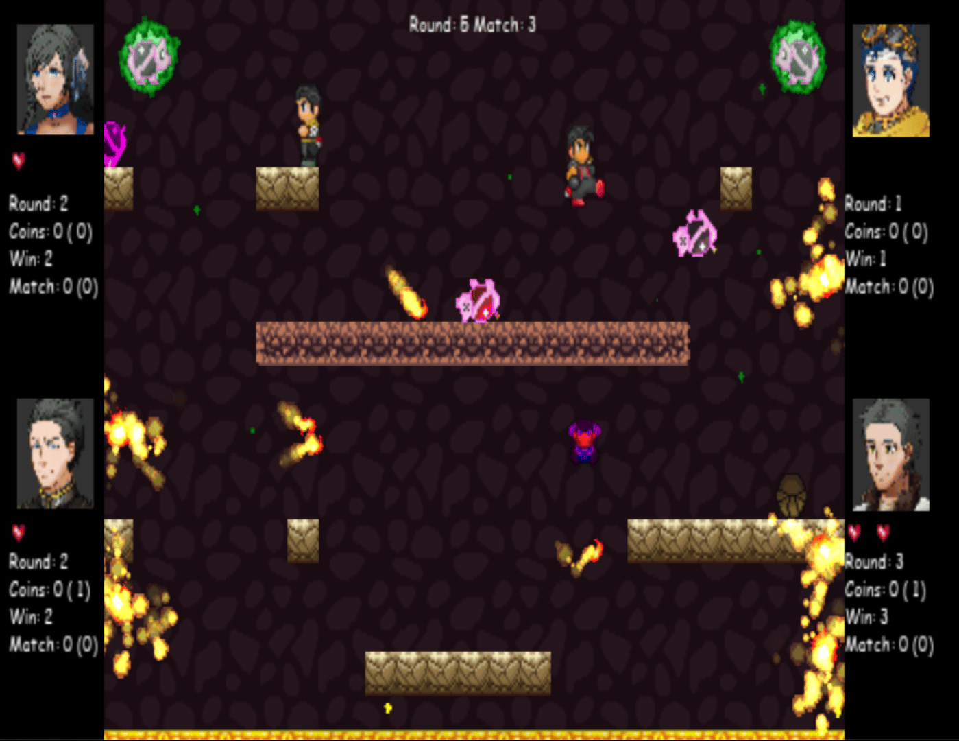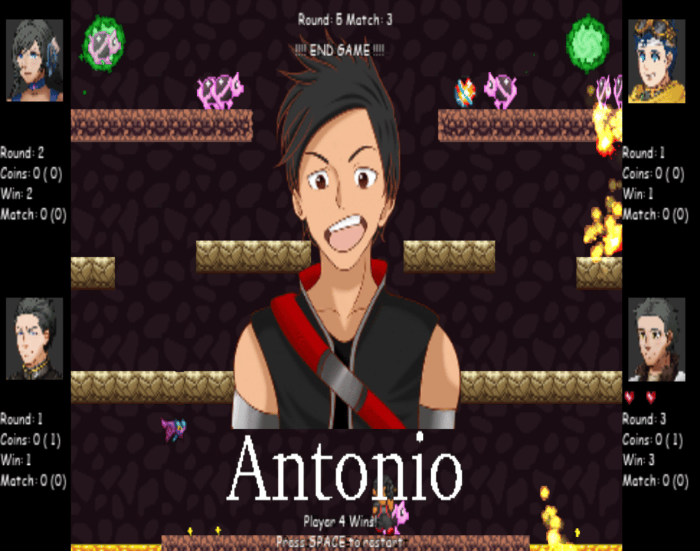 Harken back to the old school platformers! Heavily inspired by an Arcade Classic, use attacks, powers, and advanced tactics to eliminate enemies or your friends! Win by collecting 5 coins or being the last man standing! One thing is for sure, skills pay the bills!