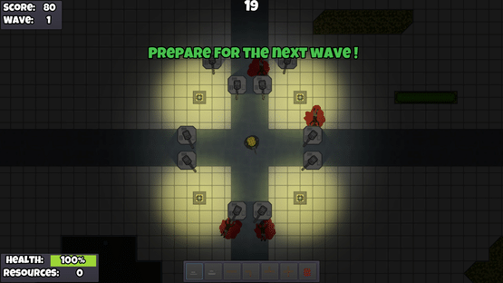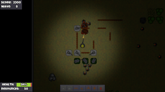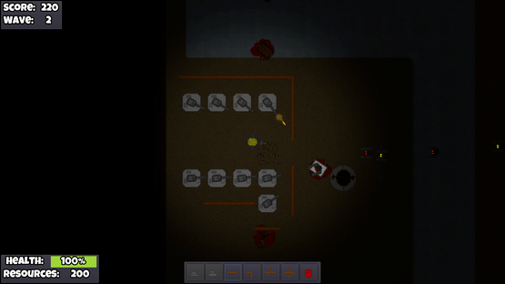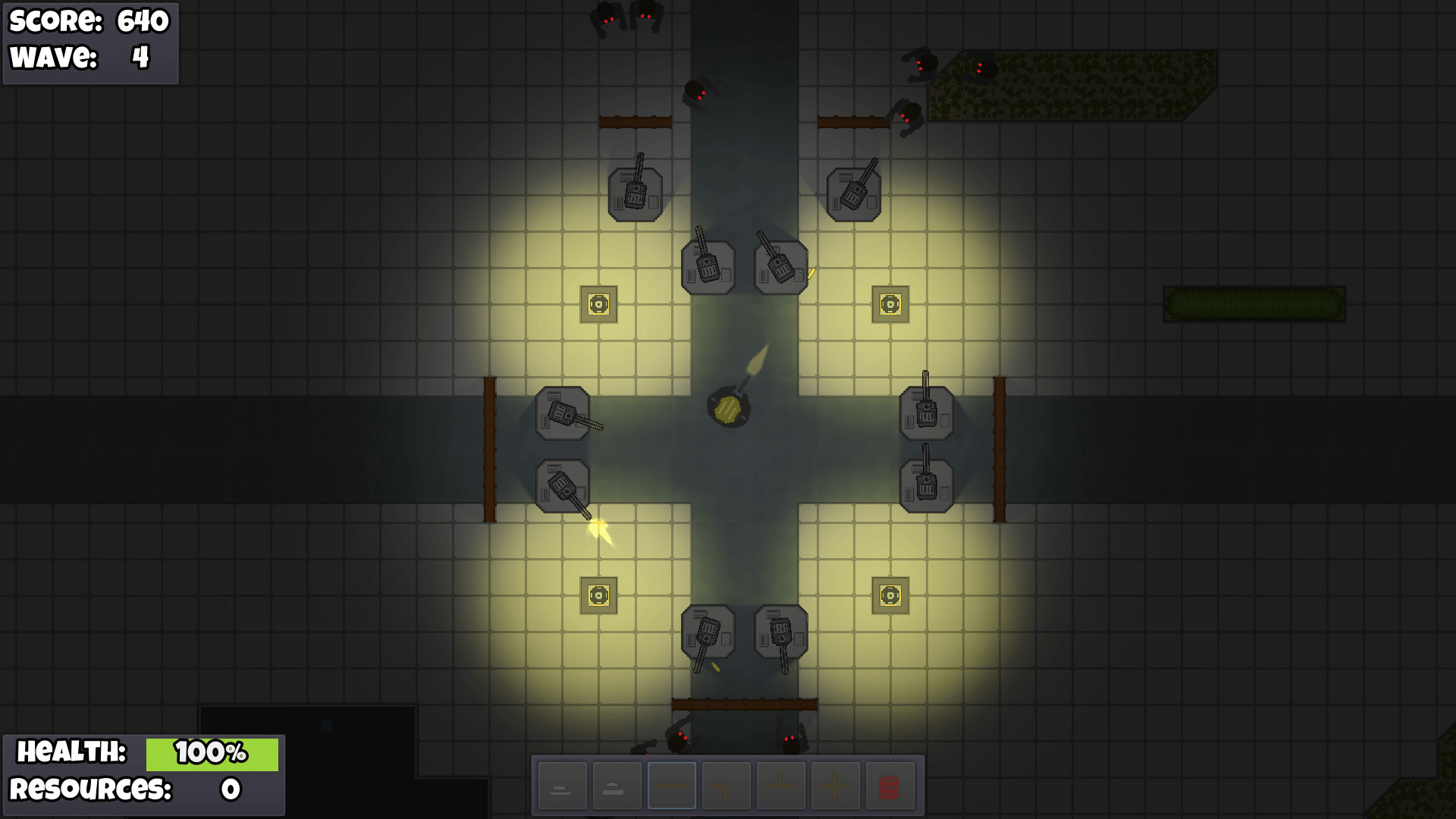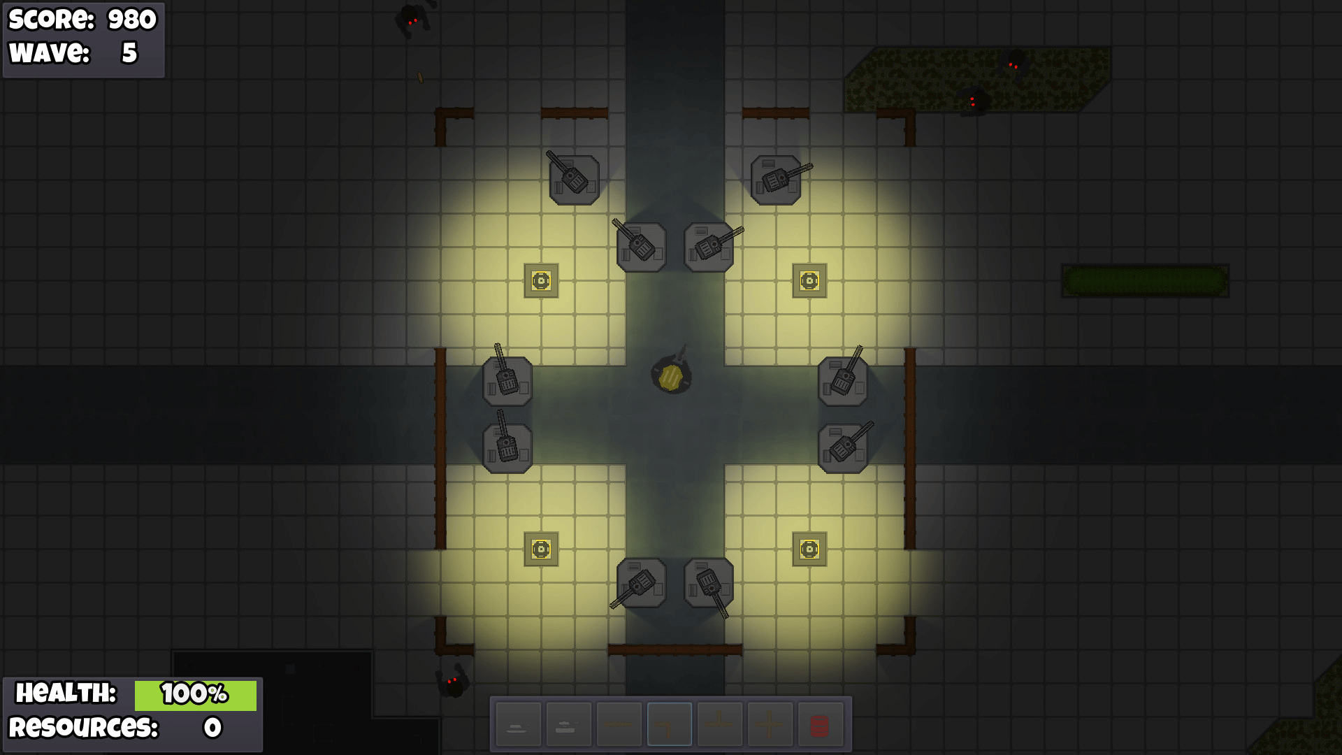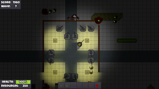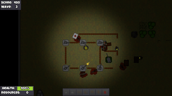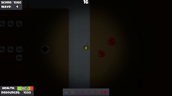 2D topdown zombie survival shooter, build defences, survive the waves of zombies