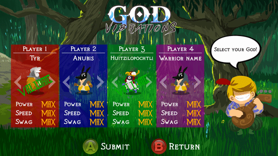 Multiplayer 2D platform versus game for 2-4 players inspired by Smash Bros and Towerfall, where jumpy kawaii gods fights in locations where the ground vibrates to the music. All of that because of that bard who sing stories about gods he doesn't know!