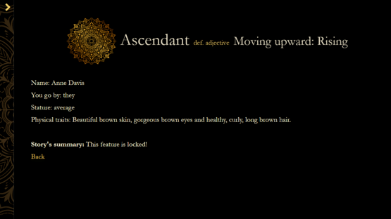 Ascendance is a text-based fantasy love story about the first contact between humanity and the extraterrestrial beings known as The Y. Though the premise is a very fertile (and fun!) ground for sci-fi, Ascendance is inspired by several concepts from different spiritualist philosophies, as well as by great fantasy stories, so it might bring a different perspective for you!