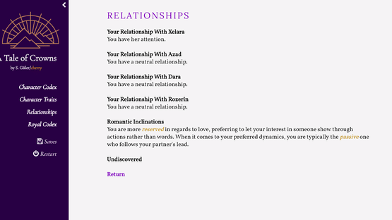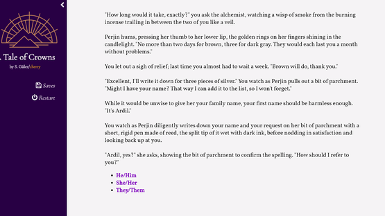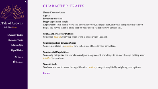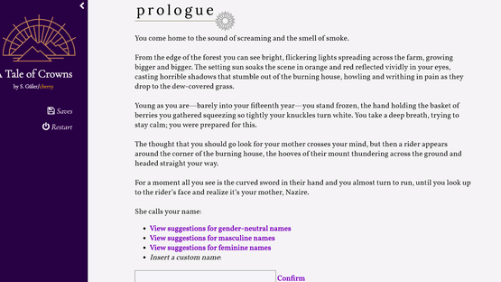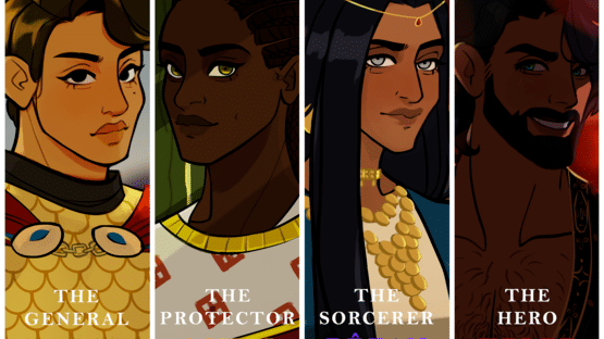 A Tale of Crowns is a high fantasy romance with Middle Eastern roots. It’s entirely text-based, with choices throughout to shape both your main character’s personality and skills as well as influence their relationships with others. There are four love interests for you to choose from, both female as well as male, each with their own stories and secrets for you to uncover!