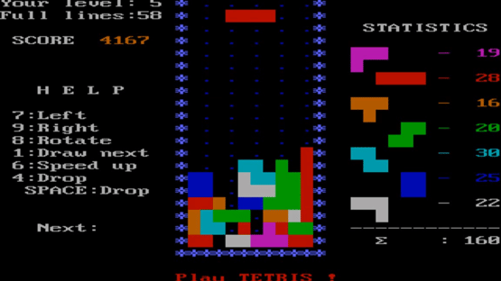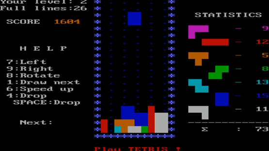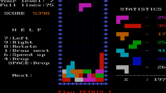 The second version of Tetris was programmed by Vadim Gerasimov and Dmitry Pavlovsky for the IBM PC, which was more modern the Elektronika 60 computer for which the original version was programmed. The new version added a score board and colors for the tetriminoes. Like the first version, this version also wasn't meant for commercial release.