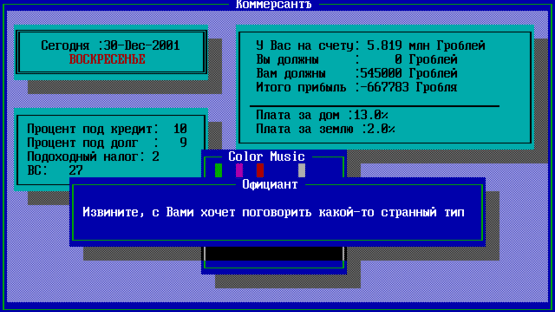 Kommersant is a Soviet computer game developed and released by the Kiev company Rada Ltd in 1991. The author of the game is Vladimir Kharchenko, better known as a poet and artist. The game was distributed free of charge through the FidoNet network and was released on bootleg game discs. Kommersant is an economic strategy in which events take place in real time, but are paused to await the user's reaction. The player takes on the role of a merchant, whose goal is to increase wealth through commercial transactions: buying and selling, depositing and loaning funds in a bank, buying from dubious persons at a low price, concluding various transactions, and the like.