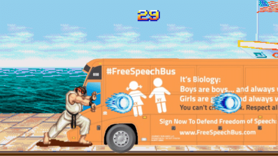 Fight off a hateful, ignorant ideology manifested as a bus.