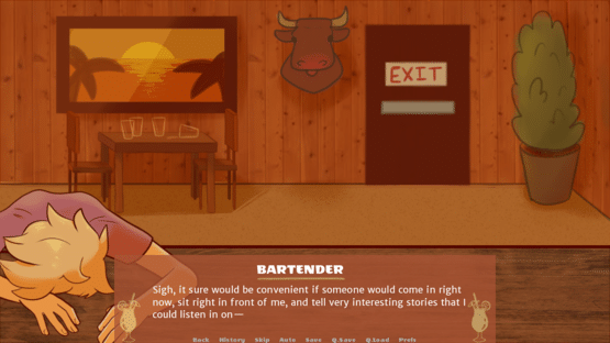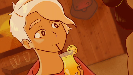 Two men sitting in a bar talking about their lives in a cyberpunk-inspired setting.
