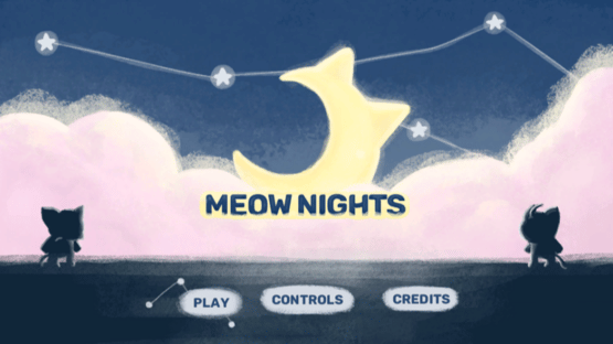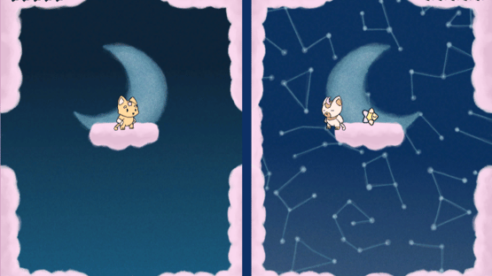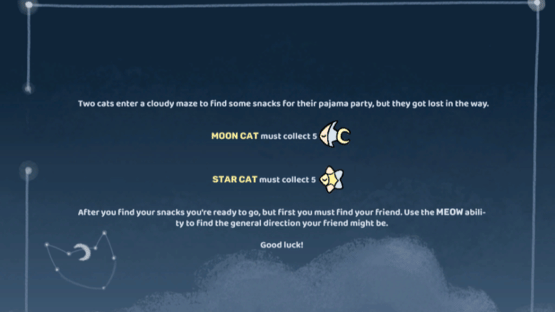 Two cats get lost on a magic and cloudy dungeon while looking for some delicious sky fish. They will have to find 5 fish each and then make their way towards each other, so they can go home and have a cozy sleepover. There is a catch, however. The cats cannot see each other. For that reason, they have to follow their friend's "meow" ability so they make their way to the same room, after catching their share of snacks. Once this happens, both cats must "meow" so they can free themselves from the cloudy dungeon.