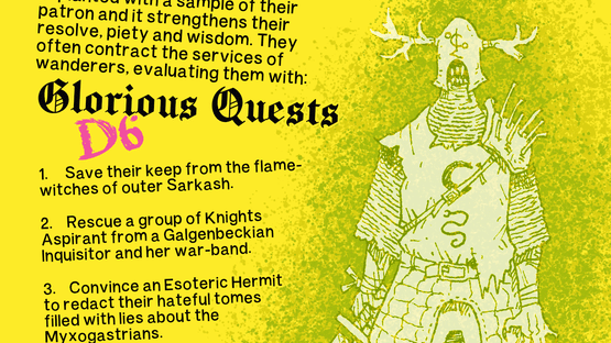 The Knights of the Myxogastrian Order are devoted to their beloved Slime Mould. Every aspirant is implanted with a sample of their patron and it strengthens their resolve, piety and wisdom. They often contract the services of wanderers, evaluating them with glorious quests.