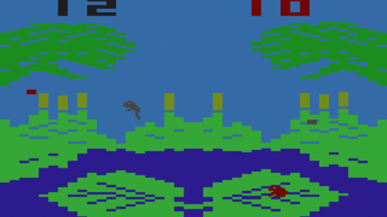 Frog Bog is a video game released by Mattel Electronics in 1982, developed by APH Technological Consulting. Players control a frog on a lily pad, competing to catch the most insects within a three-minute time limit. The challenge involves using the frog's tongue to capture flying insects while avoiding falling into the water, which would waste valuable time. The game features a dynamic day-night cycle that progressively makes insect catching more difficult as the background transitions from morning to night, adding complexity to the gameplay. The player with the most insects at the end of the time limit wins the game.