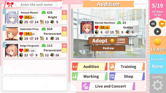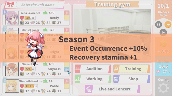 Raise up idols by idling! Idols have random names, appearances, stats, and personalities. Choose the one and only idol and raise it to become a top idol! A score-attack type simulation game where you train idols whose appearance and ability are randomly generated!