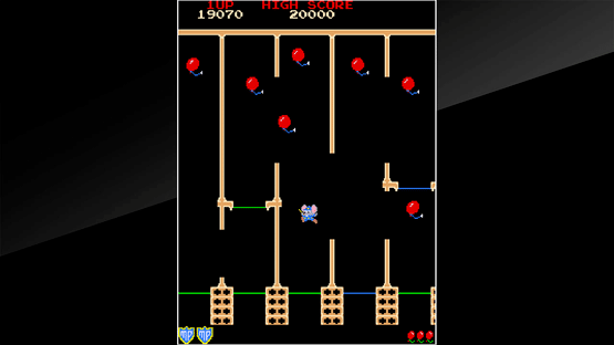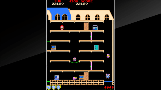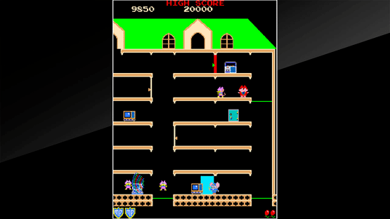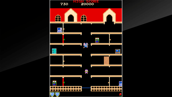 Mappy is an action game released by Namco in 1983. Players control Mappy, an enthusiastic, committed police officer on a mission to reclaim stolen goods from a mansion. Avoid getting caught by Nyamco and Mewkies while you take back the goods!