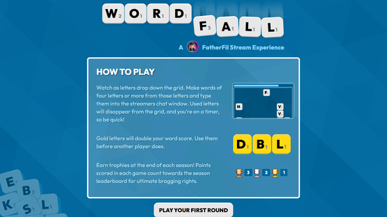 Make words using the letter tiles that drop down the grid. Used letters will disappear from the grid, and you're on a timer, so be quick! Play against other viewers, on stream, and battle for the highest score for the game and the season leaderboard.