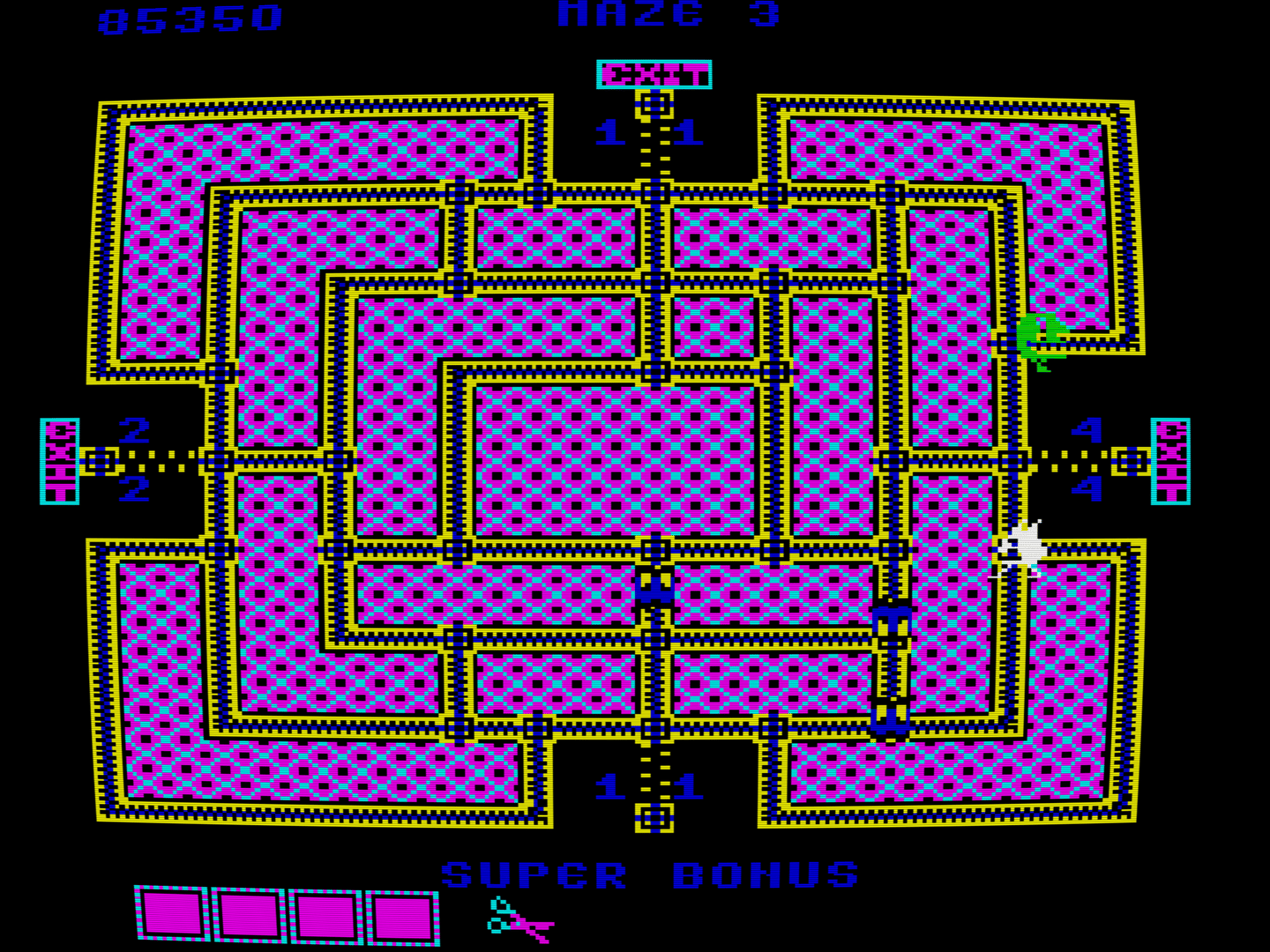 Pepper II is a maze game with zip! The object of Pepper II is simple enough, all you do is zip closed sections of the maze and they will become filled with color. Zip in all the sections of the maze and it's complete. However, if you backtrack you might unzip your path, so be careful! Each stage has four mazes you must complete to move on, but you can move from maze to maze by using the exits located at the top, bottom, and sides of the screen. And don't forget about the bad guys trying to take you out all the while. If one touches you you're toast! You can fight back by zipping sections of the maze closed that contain power-ups that will make you invincible for a short time or clear the screen of all the baddies. The game keeps getting harder as you progress to higher stages.