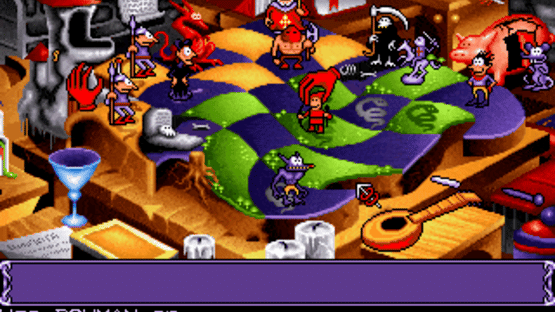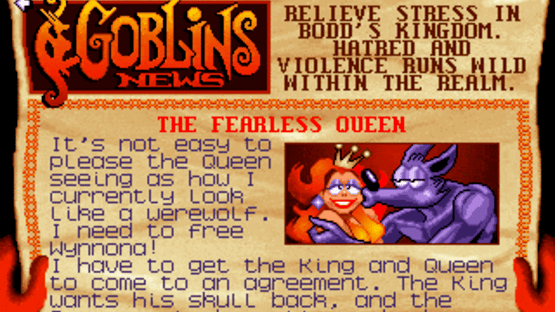 It is said that there is a mysterious labyrinth harboring great secrets that might fulfill the wishes of those who discover them. Two countries respectively ruled by Queen Xina and King Bodd have been competing over the right to explore the labyrinth. However, strange events started happening one after the other: the guardian of the labyrinth died, his daughter disappeared, and King Bodd apparently fell under some sort of a curse. A goblin reporter named Blount get caught in the midst of these events as he attempts to interview the queen and the king. As if that weren't enough, Blount also gets bitten by a werewolf and falls in love, and must find a way to deal with both predicaments. Goblins Quest is the third entry in the Gobliiins series. Like its predecessors, it is a puzzle adventure game with the emphasis on solving complex tasks confined to smaller areas rather than on exploration. Most levels occupy more than one screen and allow limited navigation between different areas. As the reduction of the title to a single "i" implies, this installment only features one controllable goblin. However, at various points of the game Blount will require assistance from other player-controlled characters such as Chump the parrot, Ooya the magician, and Fulbert the snake. In addition, Blount's own spontaneous transformation into a werewolf may affect the solution of some puzzles. The hero will also undergo a few other mutations and drastically change his size during the course of the game.