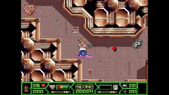 In a futuristic Manhattan, a normal kid called Cyril is scanning the airwaves and receives some information about an alien invasion planned to take place in planet earth shortly. So he decides to take his flying skateboard and his gun and go hunt those aliens. This is a platform game where you shot your enemies and find keycards to open your way through 32 different levels (including 3 secret ones). The game also includes a level editor.