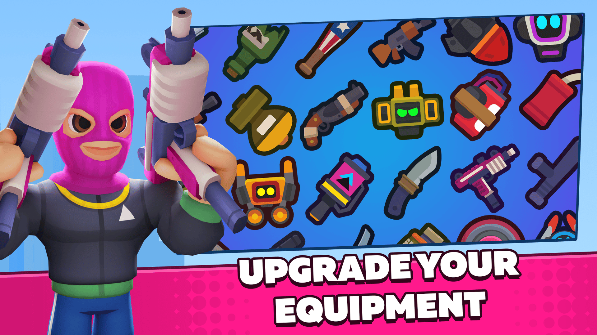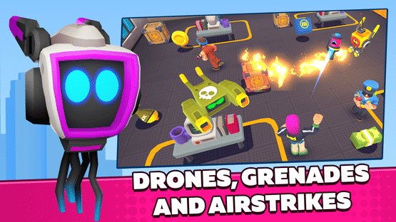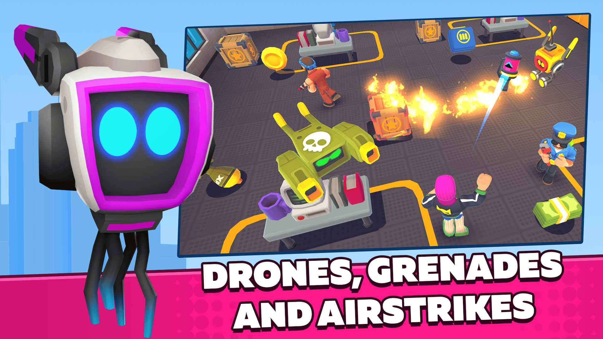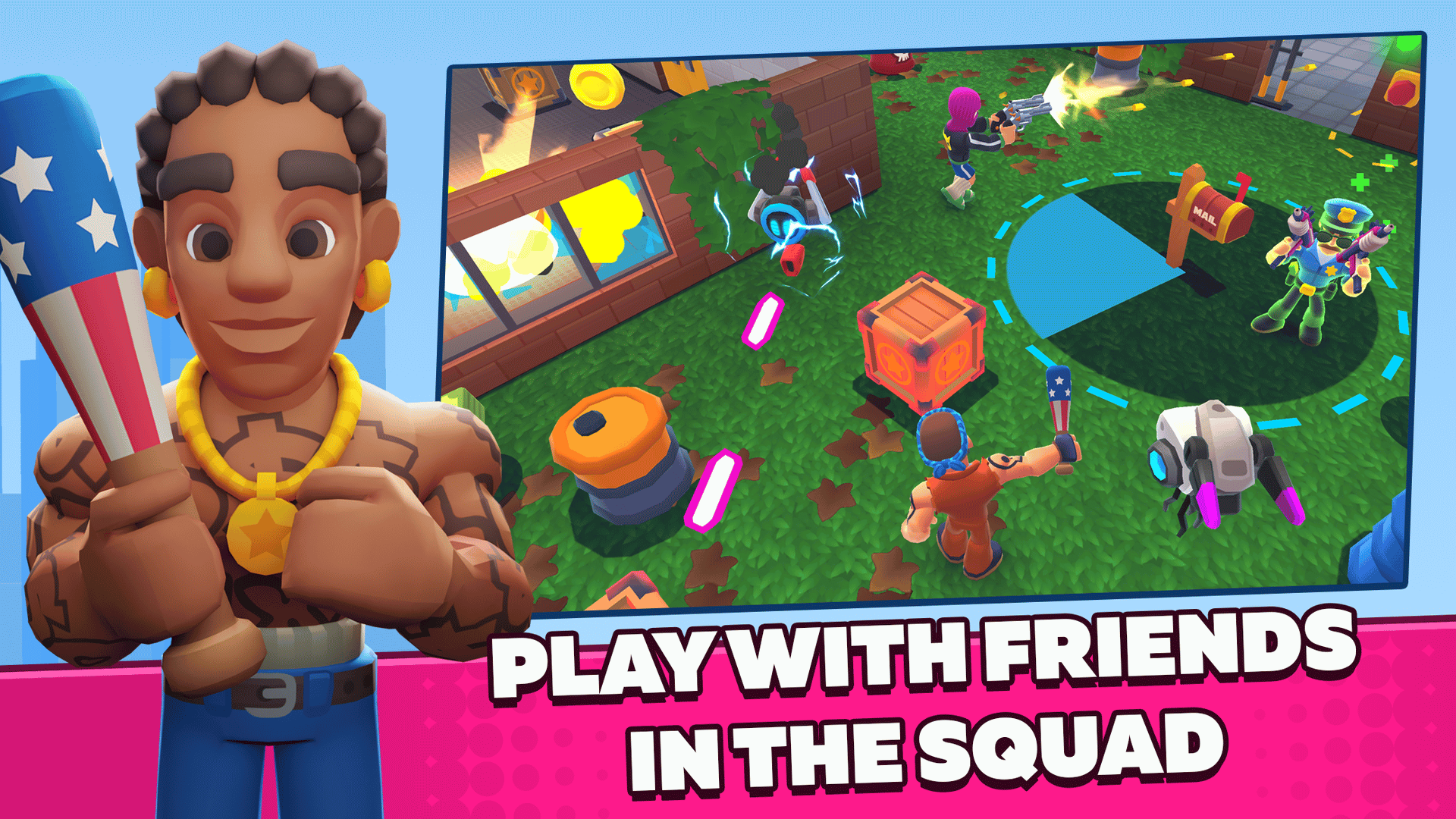 Battle against thousands in HAPPY ZONE! Upgrade characters, unleash drones and airstrikes, collect loot, and outlast 12 players to be the sole survivor. Team up with friends and climb the leaderboard to become a legend!