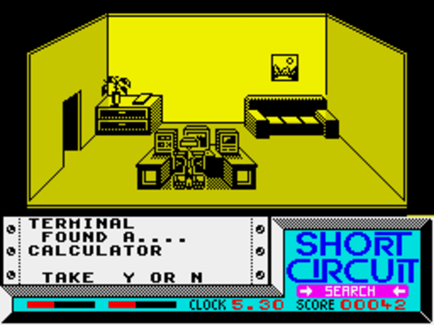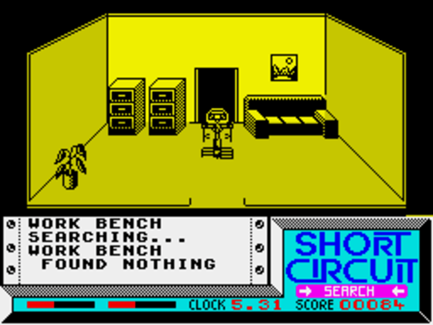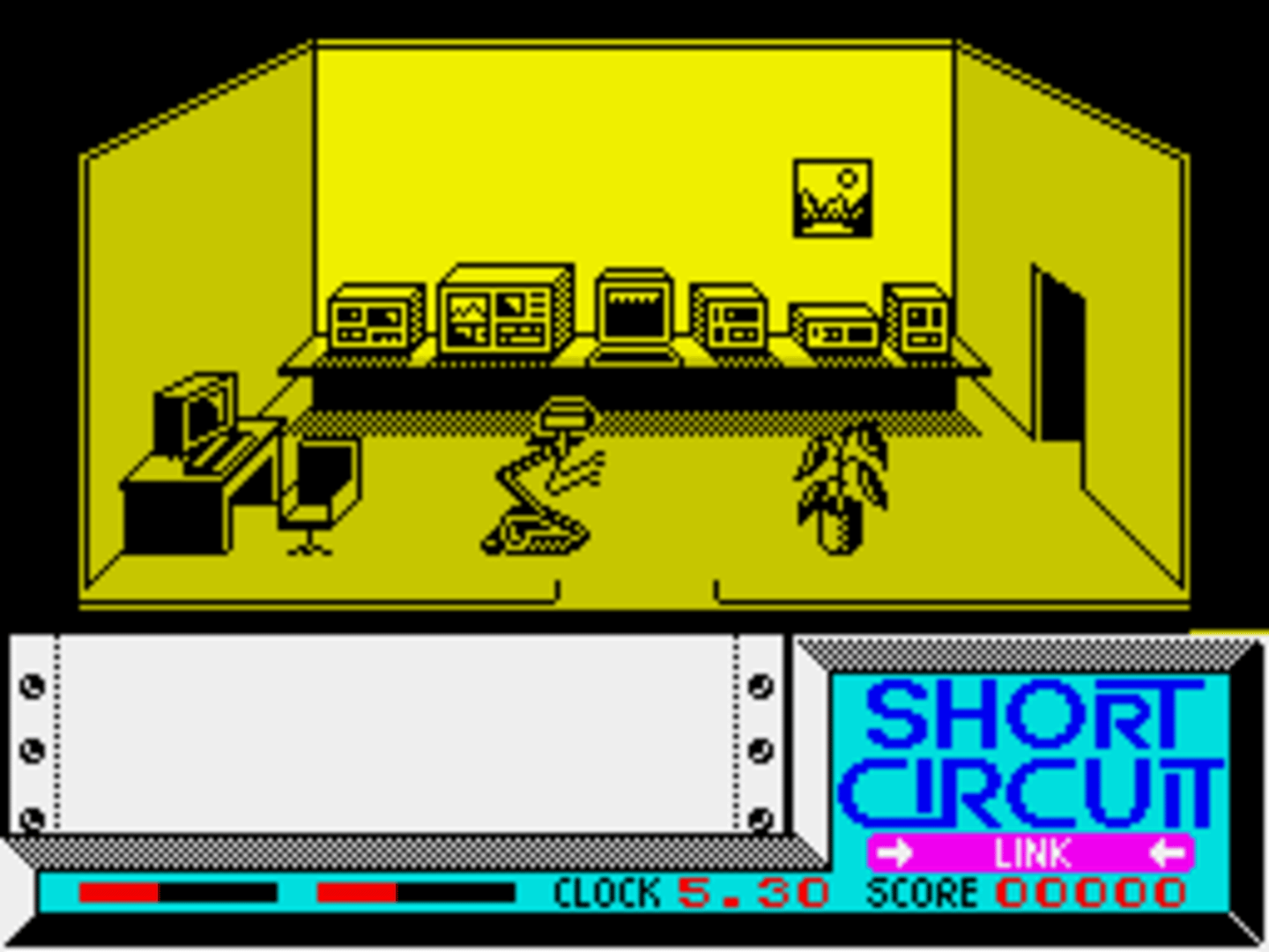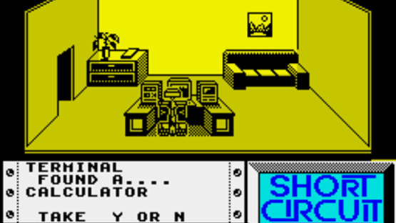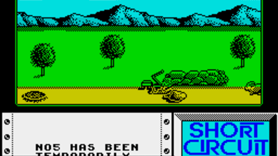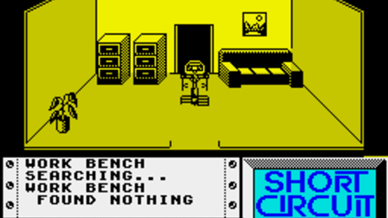 The ZX Spectrum version of "Short Circuit" is split into two parts, which differ from the Commodore 64 game, and can each be played independently. The first is viewed in third-person 3D, as our hero moves from room to room through various doors. Objects can be picked up to allow him to jump and fire. You can use objects in your possession, take them by searching desks, or link to some of the available computers to use their functionality. In the second stage, armed with jumping and shooting abilities, Number 5 must simply escape as quickly as he can. Guards and Other robots are giving chase, and should be shot. Your robot becomes increasingly depressed when he kills wildlife, and this can eventually cost you a life, so make sure you jump or duck around them.