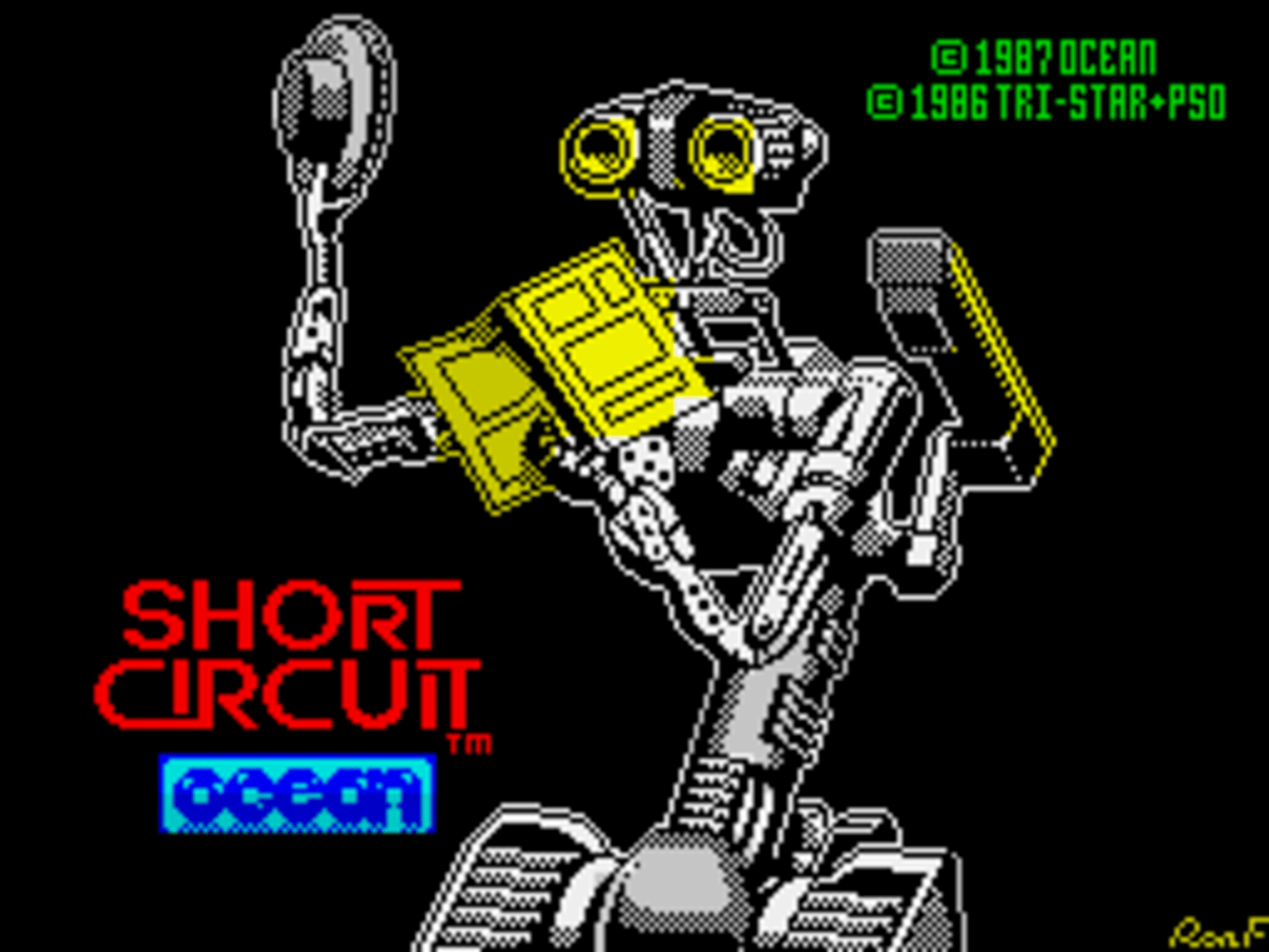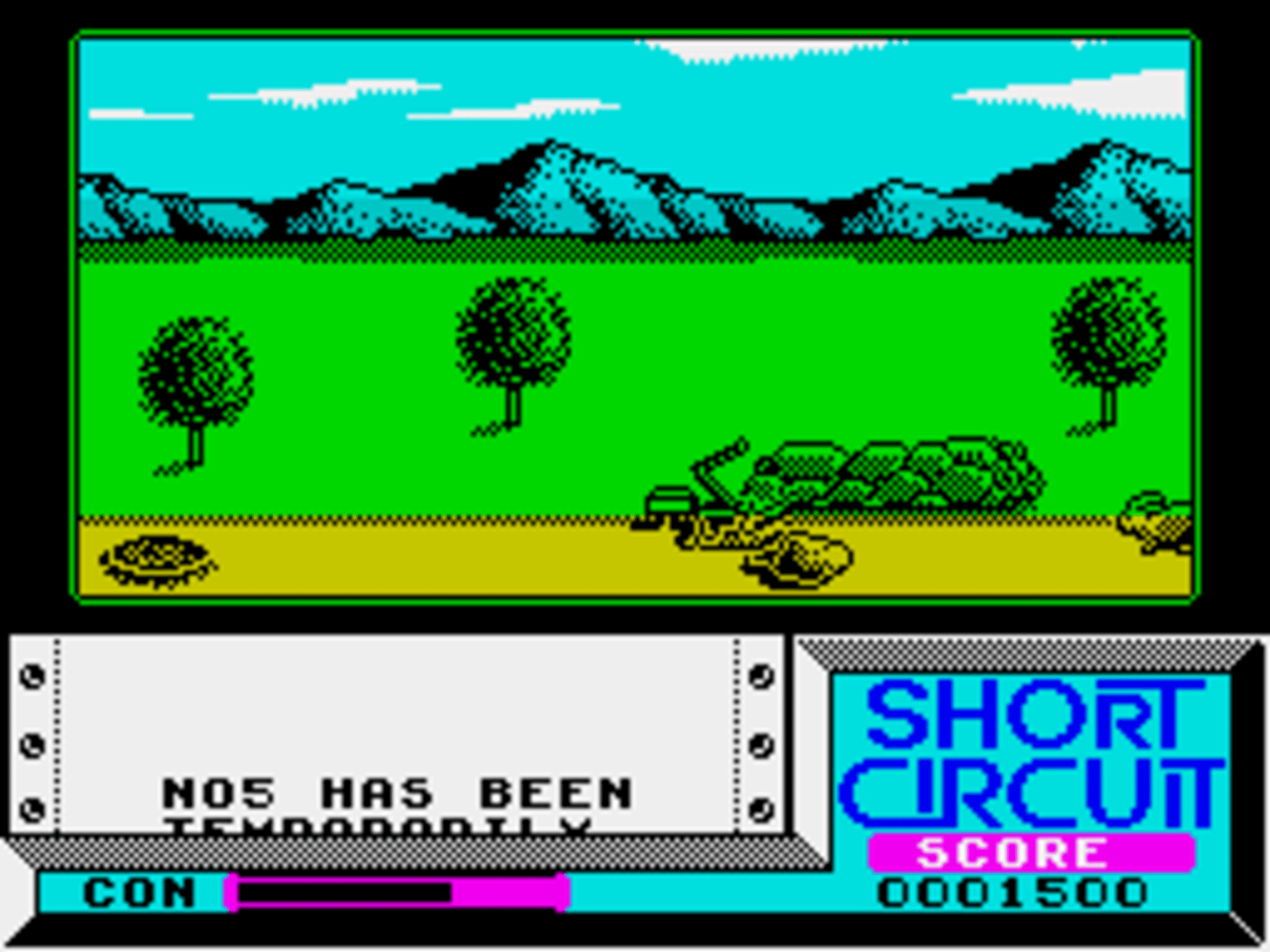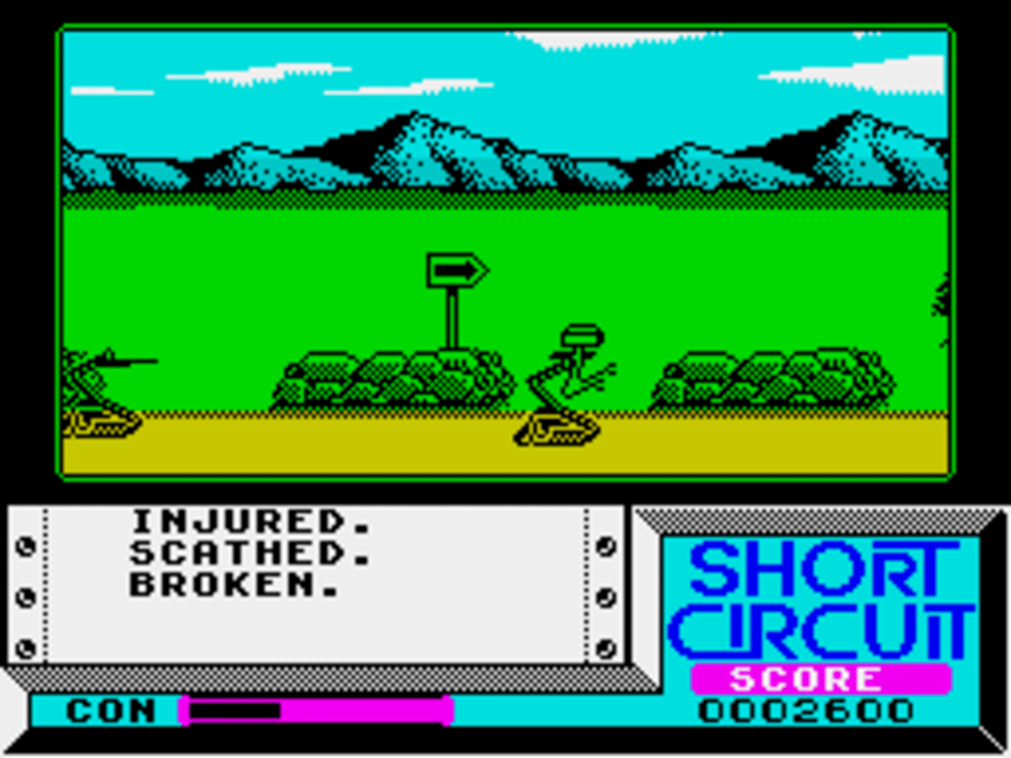 The ZX Spectrum version of "Short Circuit" is split into two parts, which differ from the Commodore 64 game, and can each be played independently. The first is viewed in third-person 3D, as our hero moves from room to room through various doors. Objects can be picked up to allow him to jump and fire. You can use objects in your possession, take them by searching desks, or link to some of the available computers to use their functionality. In the second stage, armed with jumping and shooting abilities, Number 5 must simply escape as quickly as he can. Guards and Other robots are giving chase, and should be shot. Your robot becomes increasingly depressed when he kills wildlife, and this can eventually cost you a life, so make sure you jump or duck around them.