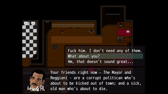 Rocco's Inferno is a top down, narrative role playing game inspired by The Sopranos and the crime films of Martin Scorsese. You play through a day in the life of Rocco Dante, a captain in the Reggiani crime Family. Who will still be living by tomorrow, is up to you.