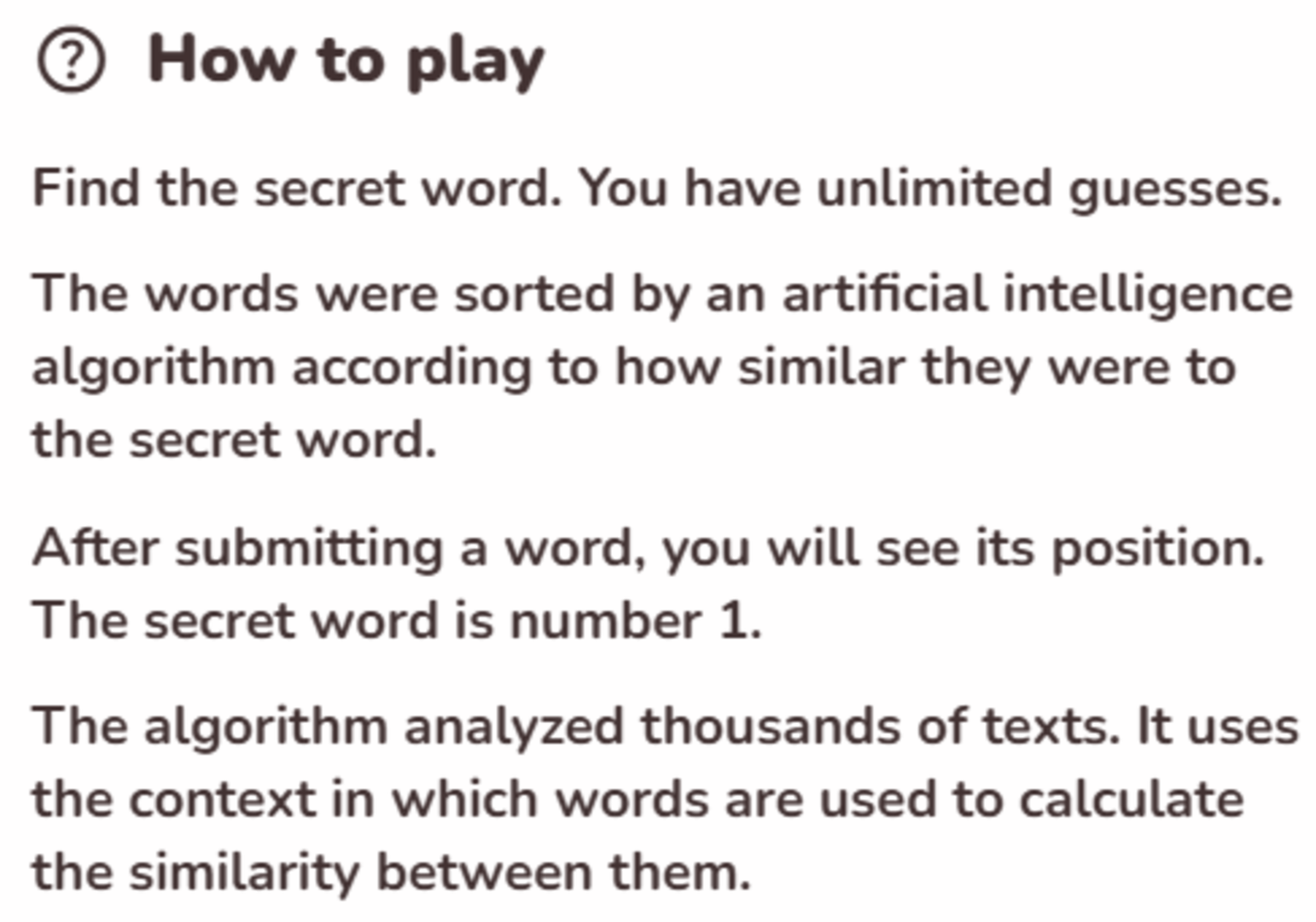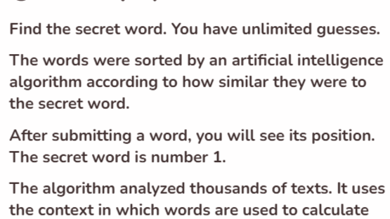 "Contexto" is a version of the browser game "Semantle", where your objective is to guess a word based a similarity calculated by AI. With each attempt, the game will tell you how close you are to the answer.