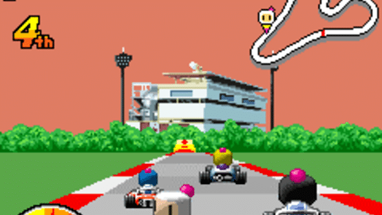 A racing game using simulated 3D in the vein of OutRun or Rad Racer, now with a rainbow of Bombermen in the drivers' seats! Race against five opponents across three difficulties of Grand Prix, for a total of six courses. Racers can collect items from question mark panels, ranging from projectiles such as bombs, missiles and Slime Bombs, to situational items like landmines, shields and nitro boosts. There are six different colours of Bomberman and three karts to choose from, each with their own unique stats. Alongside the Grand Prix, you can race any track alone in the Time Trial mode and aim to beat your personal beat. Records for both Grand Prix and Time Trial can be uploaded to a national server.