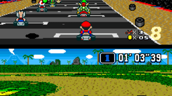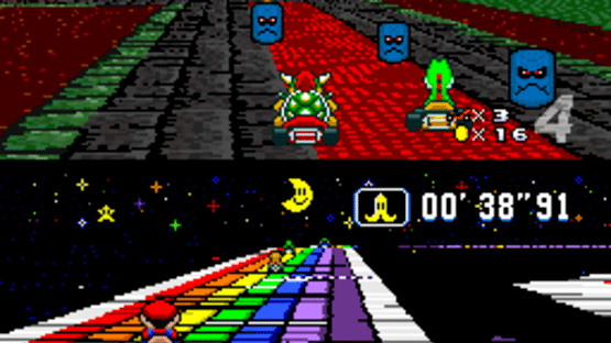 What if Nintendo created a DLC track pack for Super Mario Kart in 1992? The aim of this hack is to make a compliment to the original game. Super Mario Kart featured courses named for Mario, Koopa and Bowser. This has new themes for the other 5 characters plus a revamp of the Mario, Bowser and Rainbow Road courses. In addition to 20 all-new standard tracks, it also features 4 new battle courses. The roster is mostly the same but Donkey Kong Jr. has been replaced with regular Donkey Kong and Koopa is replaced with Paratroopa.