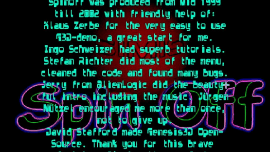 "SpinOff" (aka "3D Spinner") is a physics-based puzzle game where the player has to guide a wooden marble to the target area of a level in the shortest possible time. The marble is only indirectly controlled by tilting the level with the mouse to make it move in that direction, taking inertia into account. There are 14 levels in total, with most of them containing hazards such as holes, ice, fire, glue, or dangerous creatures. In addition to items that need to be collected on the way, some levels require the use of teleporters or special items that add features like different size and transparency. The levels are timed but there is no time limit to complete them.